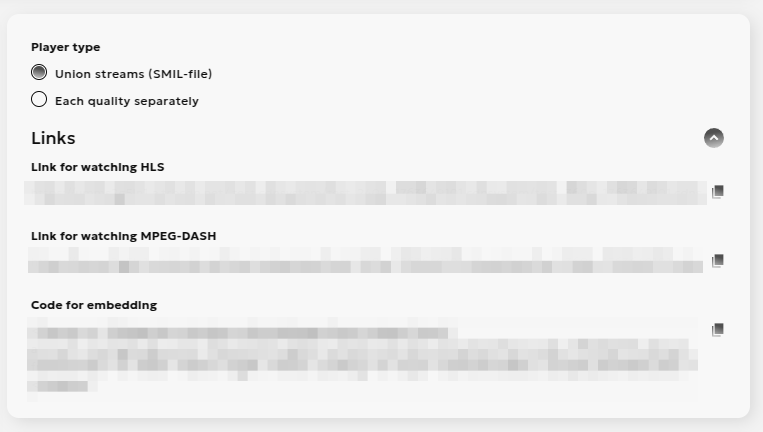 - Links for viewing via streaming protocols (HLS, MPEG-DASH)